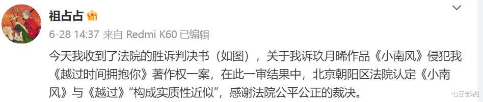 亦对影视圈追捧她的作品产生了逆反情绪。而在《你比星光美丽》开播前夕,刚好作者祖占占与玖月晞的官司一审被判胜诉,这是玖月晞第一次被正式盖章抄袭。