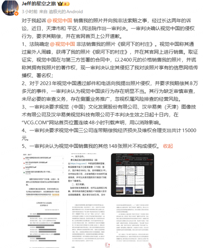但戴建峰并不接受这一说法。他联系了最初授权照片的Stocktrek Images,对方确认视觉中国没有权利销售这些作品,Getty也无权进行二次转授。他要求视觉中国停止使用他的照片。随后,相关图片在视觉中国网站下架。