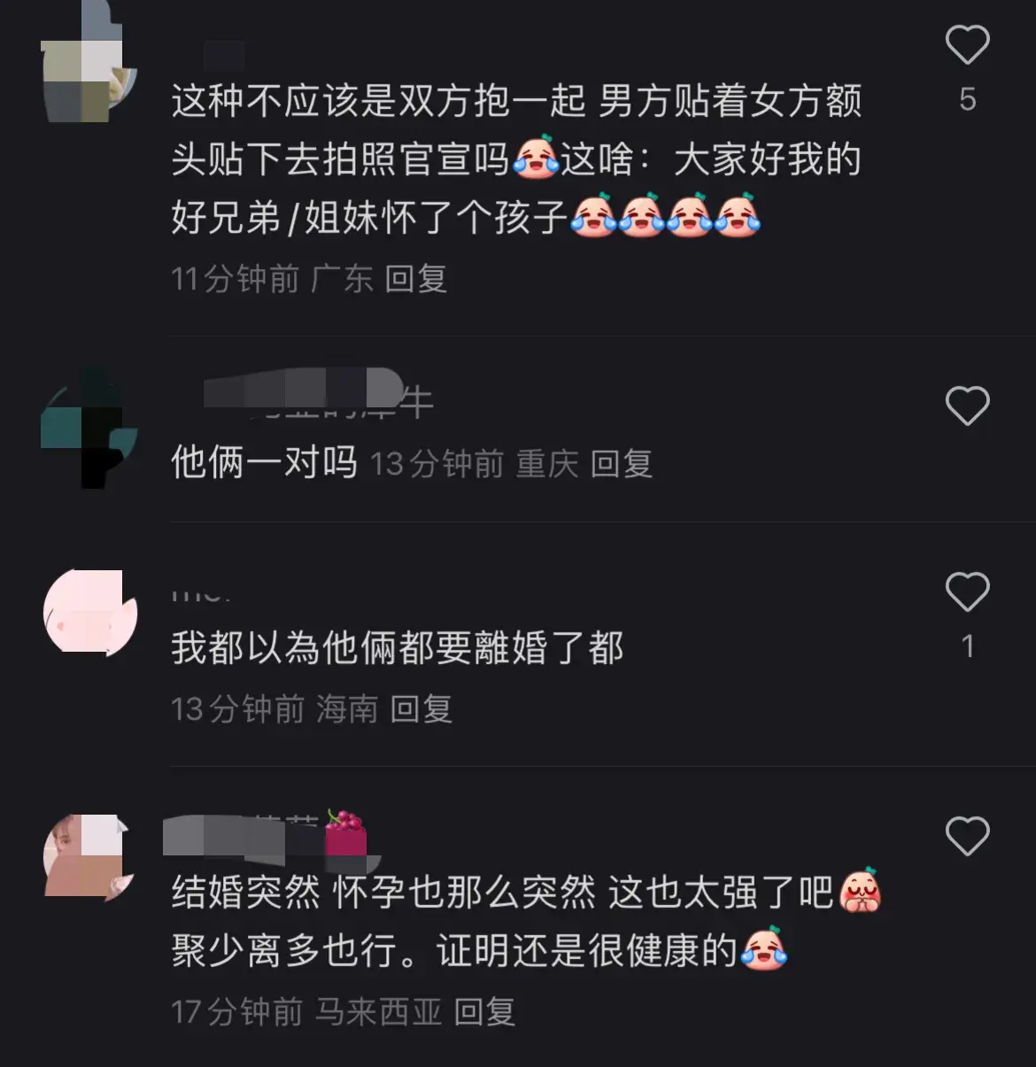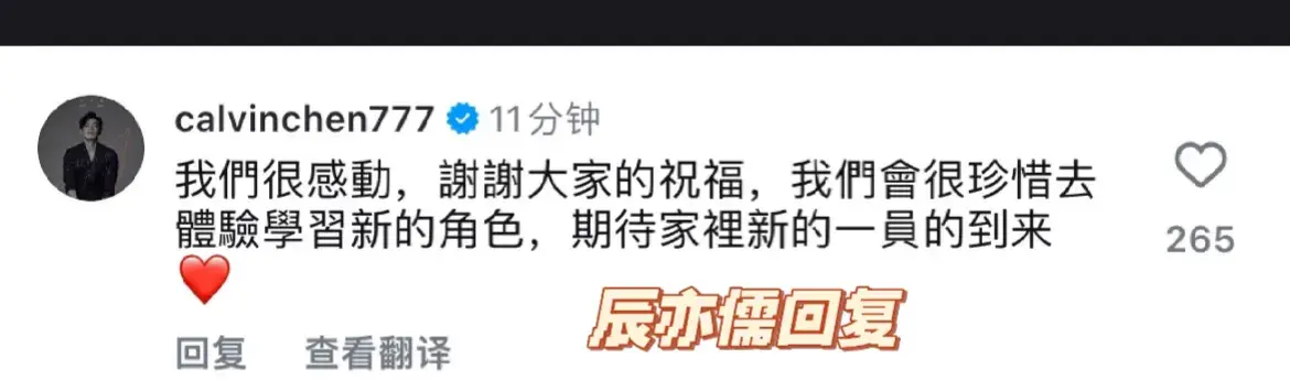 随后丈夫辰亦儒也回复到:我们很感动,谢谢大家的祝福,我们会很珍惜去体验学习新的角色,期待家里新成员的到来。