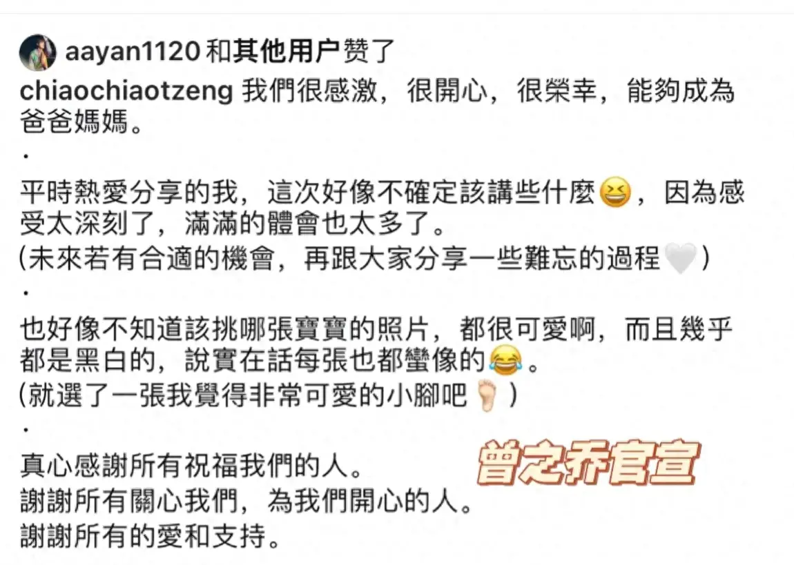 8月15日,曾之乔在个人社交平台上晒出怀孕的好消息,她发文写道:“我们很感激、很开心、很荣幸、能够成为爸爸妈妈。”曾之乔