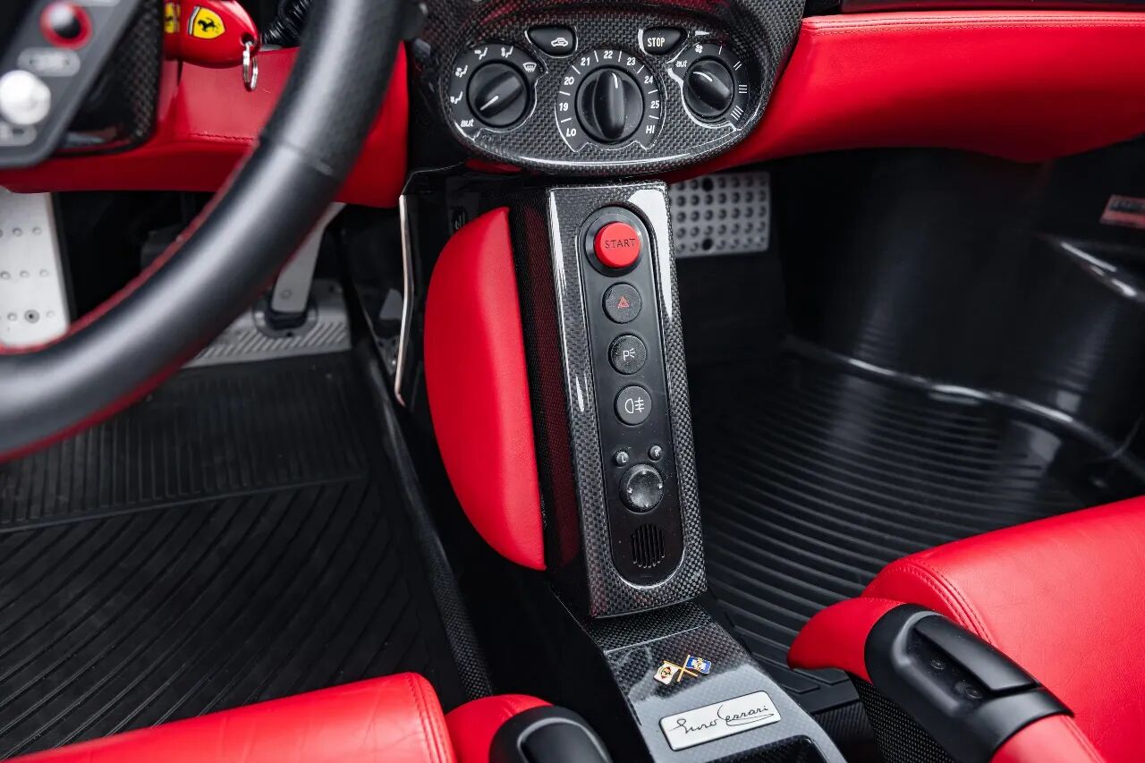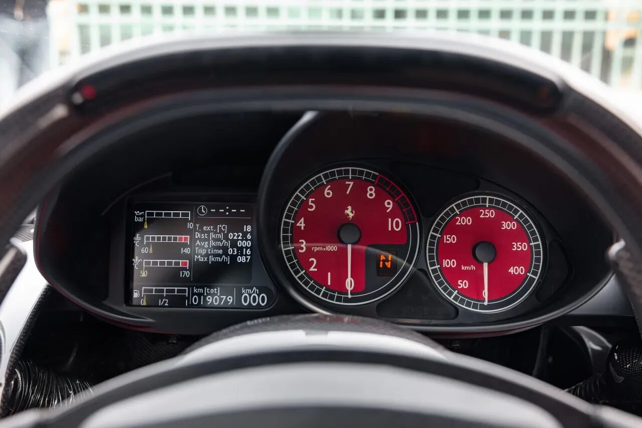 车辆最初由英国藏家订购并持有长达15年,之后辗转瑞士,2019年回归英国并经DK Engineering经手出售,全程履历清晰、来源可靠,现已获得法拉利Classiche官方认证,今年刚更换全新倍耐力轮胎,表显里程19,079公里(11,855英里),虽非极低里程,但对于一台长期被使用、养护得当的Enzo而言,状态依旧堪称顶级。
