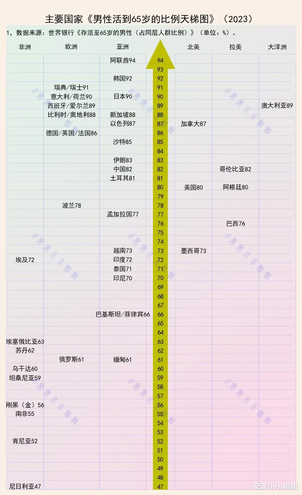 它追踪的是同一出生队列的男性,从出生到65周岁的存活轨迹。这一指标剔除了人口年龄结构差异,能更精准地反映一个社会医疗卫生水平、安全保障程度与整体生存环境对男性生命历程的影响。根据2023年数据,作者绘制了一张天梯图,清晰展现了全球男性生存机会的悬殊分布。