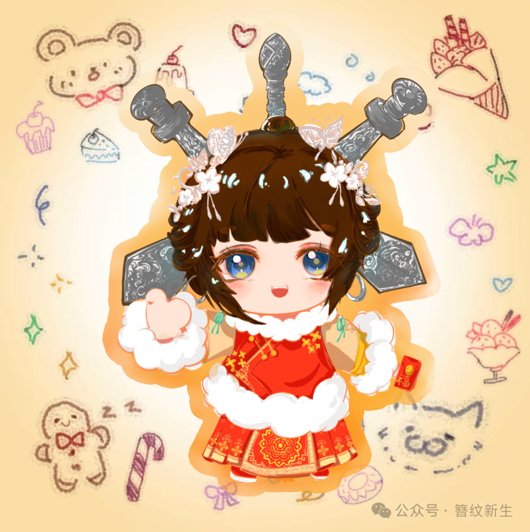 吉祥物“小福簪”以头戴三条簪的盘发少女形象为主体,放大的簪刀造型突出 “三条簪” 的标志性特征,彰显其承载的女性精神内核;整体身着红色传统节庆服饰,衣襟袖口饰以洁白毛绒,既契合传统民俗中的喜庆意象,也传递出温暖亲和的文化气质。