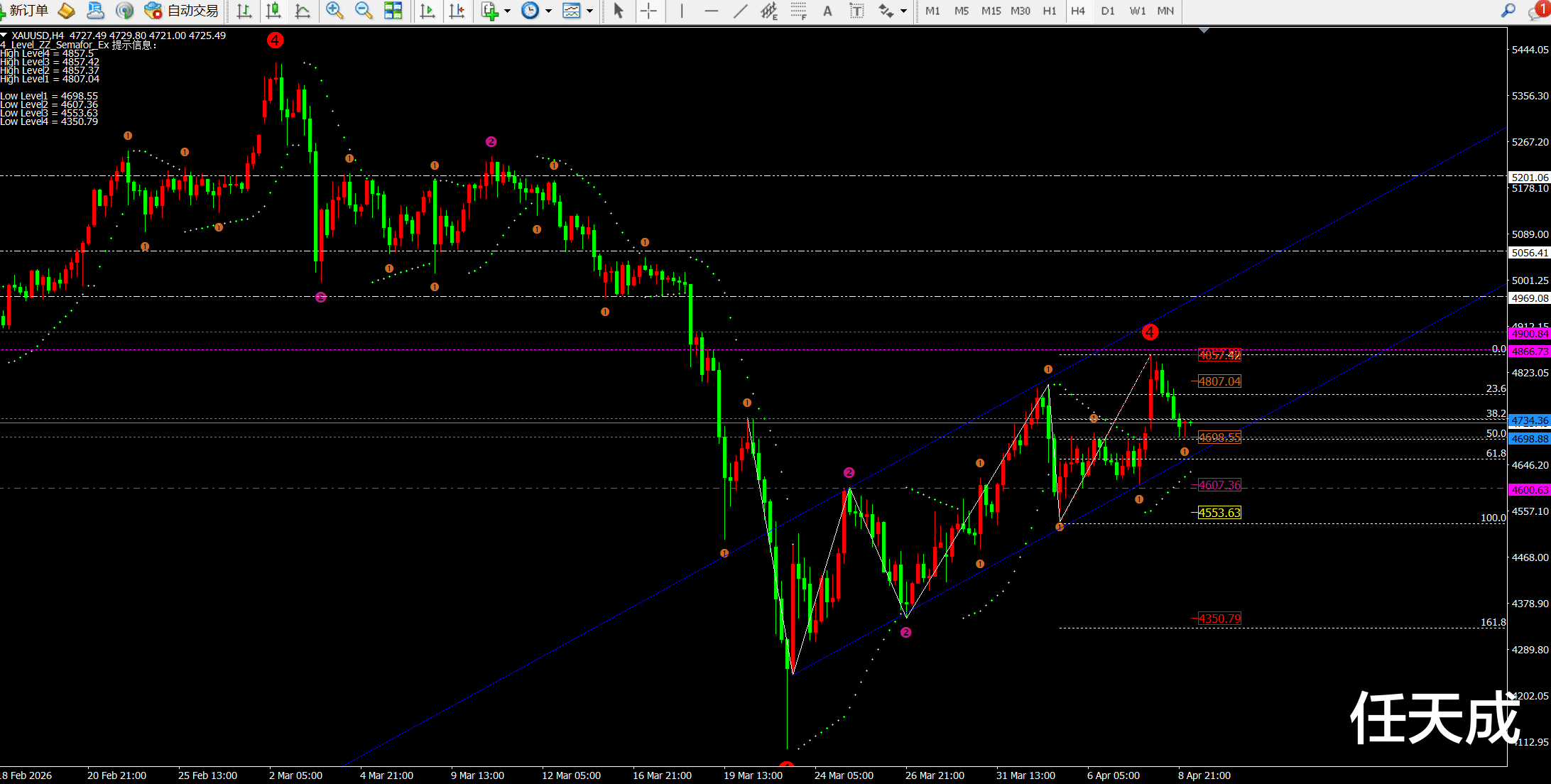 ② 4小时昨日下跌后早间4小时收线十字星,代表价格的震荡。目前我们主要关注中轨的支撑即可对应4701-4696一线,其次是下方的抛物转向点和均线MA60支撑对应4631-4608一线。不过随着时间推移都会相应抬高。而4小时的斐波拉契回调线目前支撑在0.50位置4694一线,而0.618位置位于4655一线。