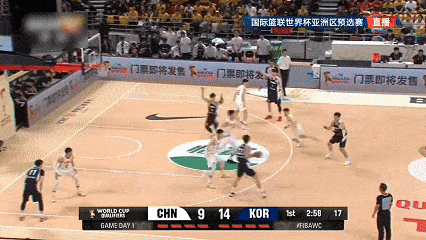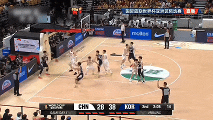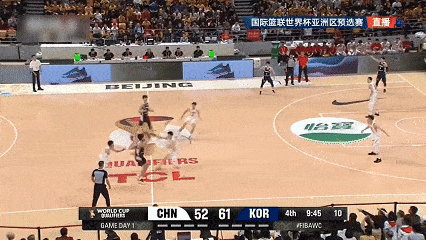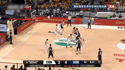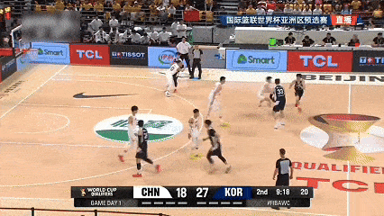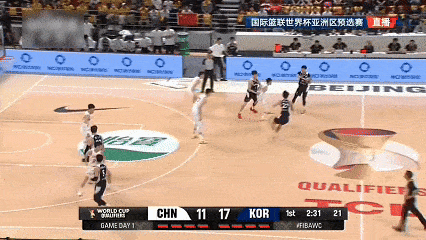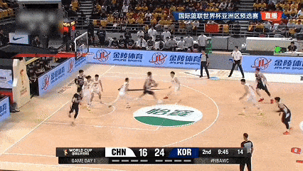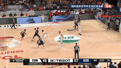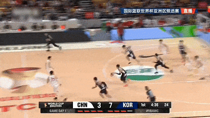 韩国队抓住乱战机会快速上球,6号李政炫假动作传球误导防守人后分球给一侧李贤重,后者在三分线外俩步接球直接出手。