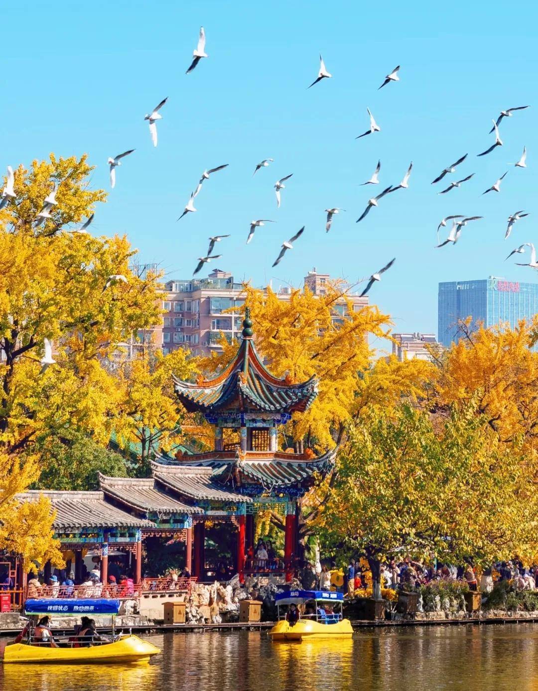 冬季是翠湖一年中最负盛名、也最热闹的季节,每年11月到次年3月,成千上万只西伯利亚红嘴鸥会如期而至,成为翠湖冬季的绝对主角,人鸥同乐,构成春城最温暖治愈的风景线。
