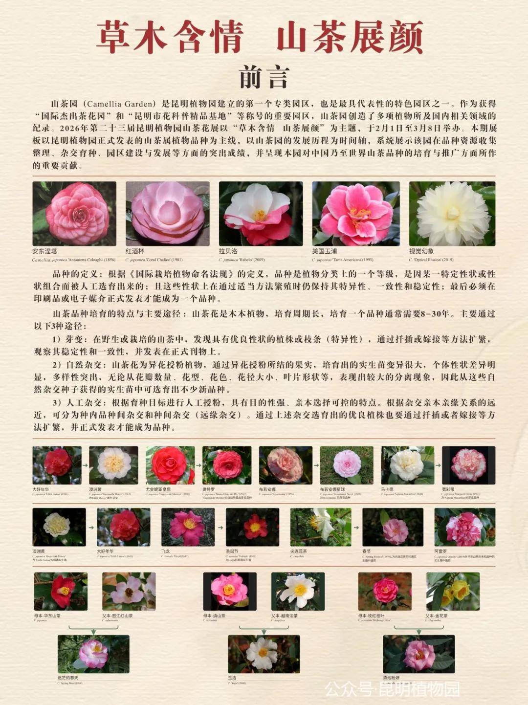 本次花展,昆明植物园科技工作者精心保育的百余盆“精品山茶”将在东园门口展出,其中有云南山茶Camellia reticulata、尖连蕊茶C. cuspidata、凹脉金花茶C. impressiervis等为代表的原生物种,也有昆园丹霞C. reticulata ‘Kunyuan Danxia’、春色浪漫C.grijsii ‘Chunse Langman’等植物园刚注册的国家授权山茶花新品种亮相。蔡希陶纪念碑旁的科普长廊尽显“草木含情 山茶展颜”话题,以山茶园的发展历程为时间轴,系统展示了山茶园在品种资源收集整理、杂交育种、园区建设与发展等方面的突出成绩,呈现昆明植物园对中国乃至世界山茶品种培育与推广所作的重要贡献。