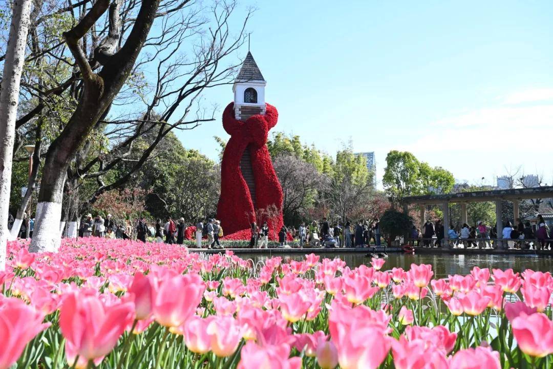 每年二三月,是翠湖郁金香的限定顶流时间,红、粉、黄、紫成片绽放,搭配翠湖的碧水、古亭以及最火“红围脖”,是昆明最具冬日氛围感的免费花海,临水机位还能拍出“花映湖面”的灵动画面。
