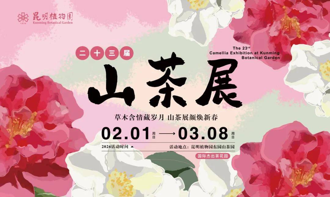 2026年2月1日至3月8日,昆明植物园即将举办第二十三届山茶展,本次花展以 “草木含情藏岁月 山茶展颜焕新春”为主题。 展出地点依然在昆明植物园东园的山茶园,6000株山茶将在一个月内陆续进入盛花期。