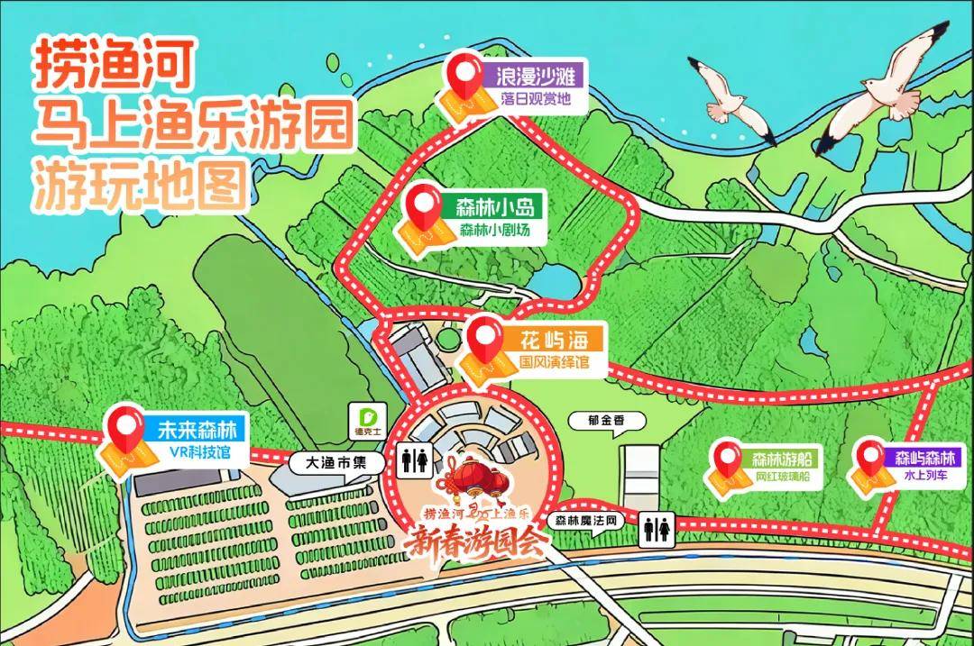 春马踏福来,大观公园里还有“拍马屁,接福气”的趣味打卡点。大红色的马形象和“福”字巧妙融合,搭配可爱灵动的海鸥主题站牌,诙谐治愈又创意十足。
