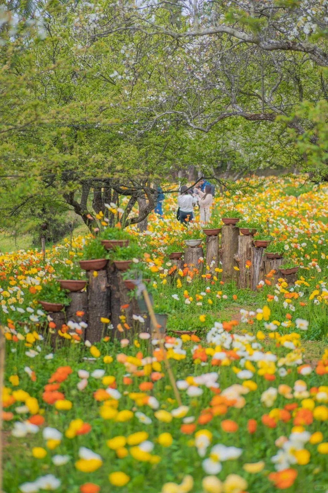 名花谷是一场西式的春日狂想,梨树下,虞美人汇成斑斓海浪——橙的、粉的、红的、白的在阳光下仿佛打翻的颜料盘,木屋、秋千、白色吊床点缀其间随手一拍,都是满满的治愈系田园风,这里被誉为“昆明版莫奈花园”名副其实。