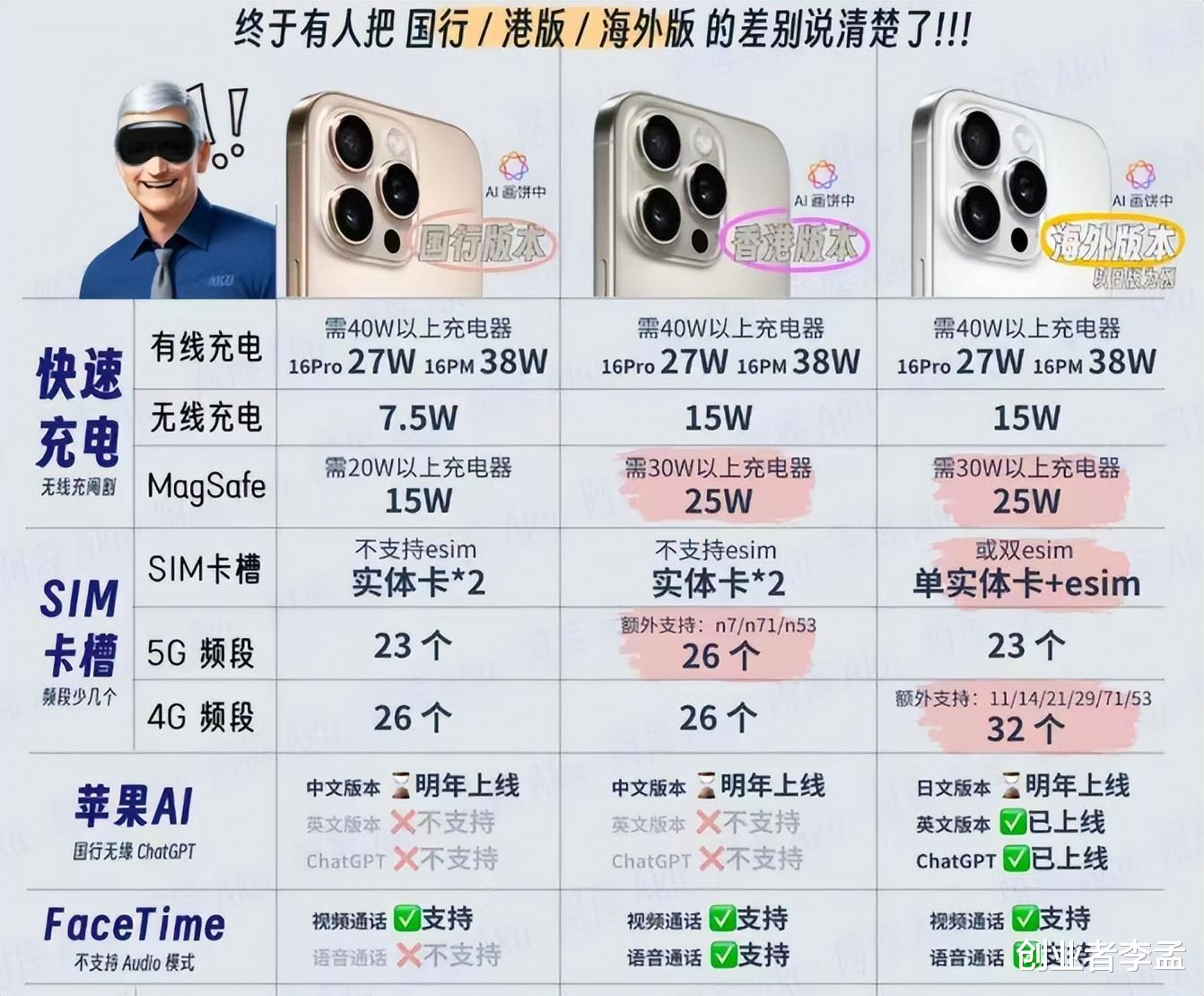 站在用户视角,功能取舍需要理性权衡:毫米波5G在国内暂无商用计划,FaceTime Audio的社交功能可被微信语音替代,而15W无线充电与20W美版的实际体验差距微乎其微。反过来看,国行机型享受的两年官方保修、碎屏险服务,以及针对国内网络环境优化的信号增强技术,这些隐性价值往往被忽视。或许真正的问题不是"失去了什么",而是如何在全球化产品与本地化需求间找到最优解——毕竟,没有任何一款跨国产品能做到让所有市场的用户都完全满意。对此大家是怎么看的,欢迎关注我“创业者李孟”和我一起交流!