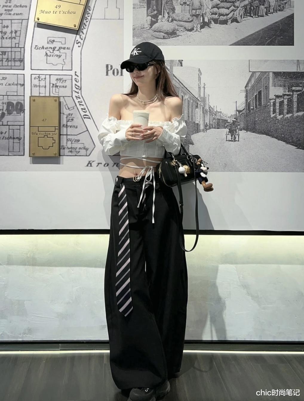 亮点:一字肩上衣的绑带设计、领带款腰饰
