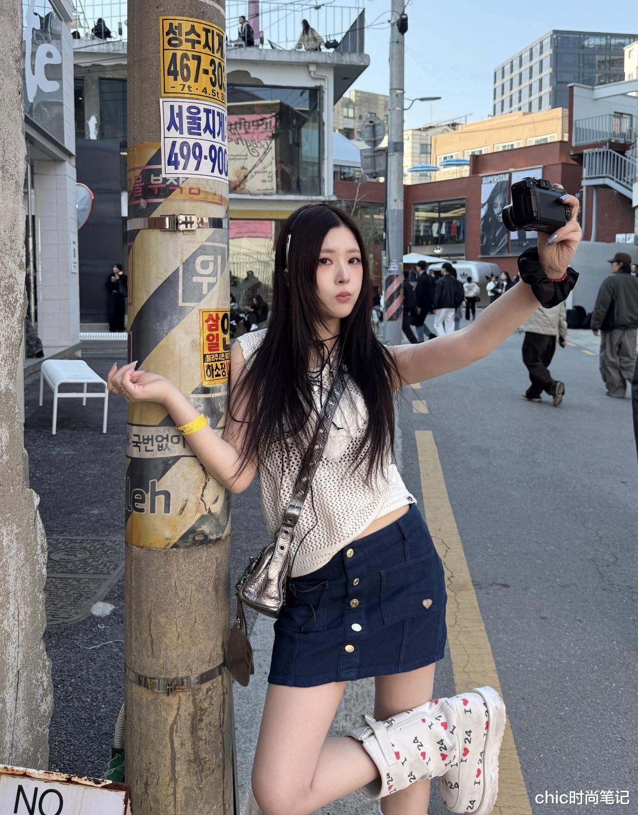 LOOK:网格背心+牛仔半身短裙+夸张白色靴子