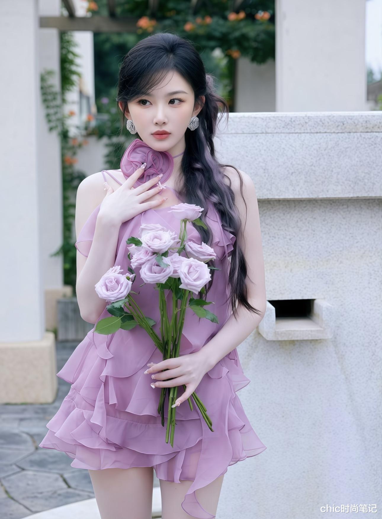 浅紫色吊带款连衣短裙自带夏天氛围感,轻盈的荷叶边不规则裙摆使得整个穿搭充满轻盈与活力,脖子上的同色系花朵choker是穿搭的点睛之笔。