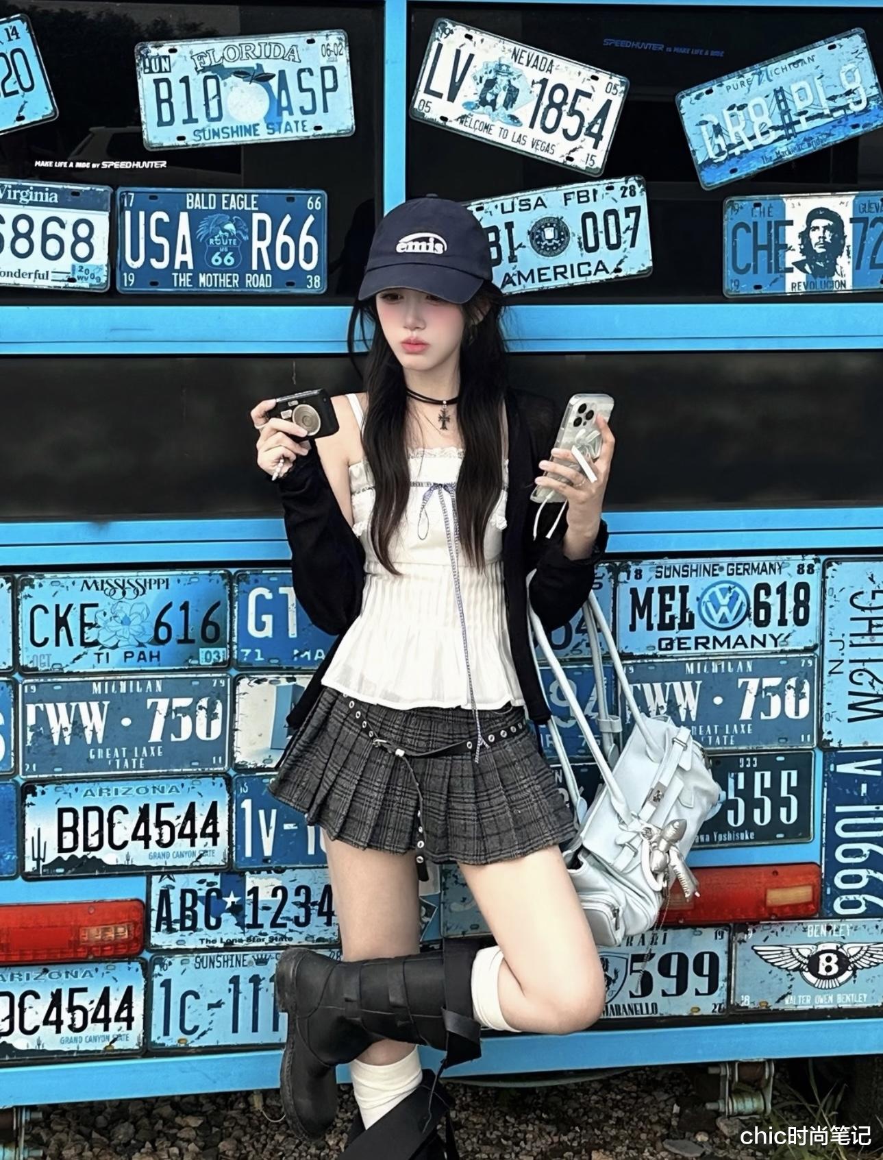 LOOK:蝴蝶结吊带+百褶短裙+高筒靴+配饰