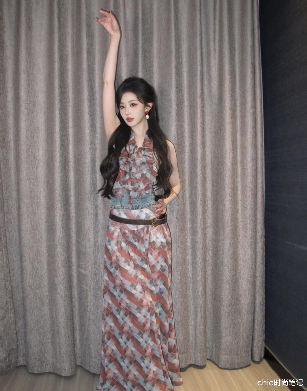 复古配色的雪纺荷叶边纺长裙拼接了做旧款牛仔,让原本就复古的风格更加摩登,腰间的棕色皮带松弛而高级。