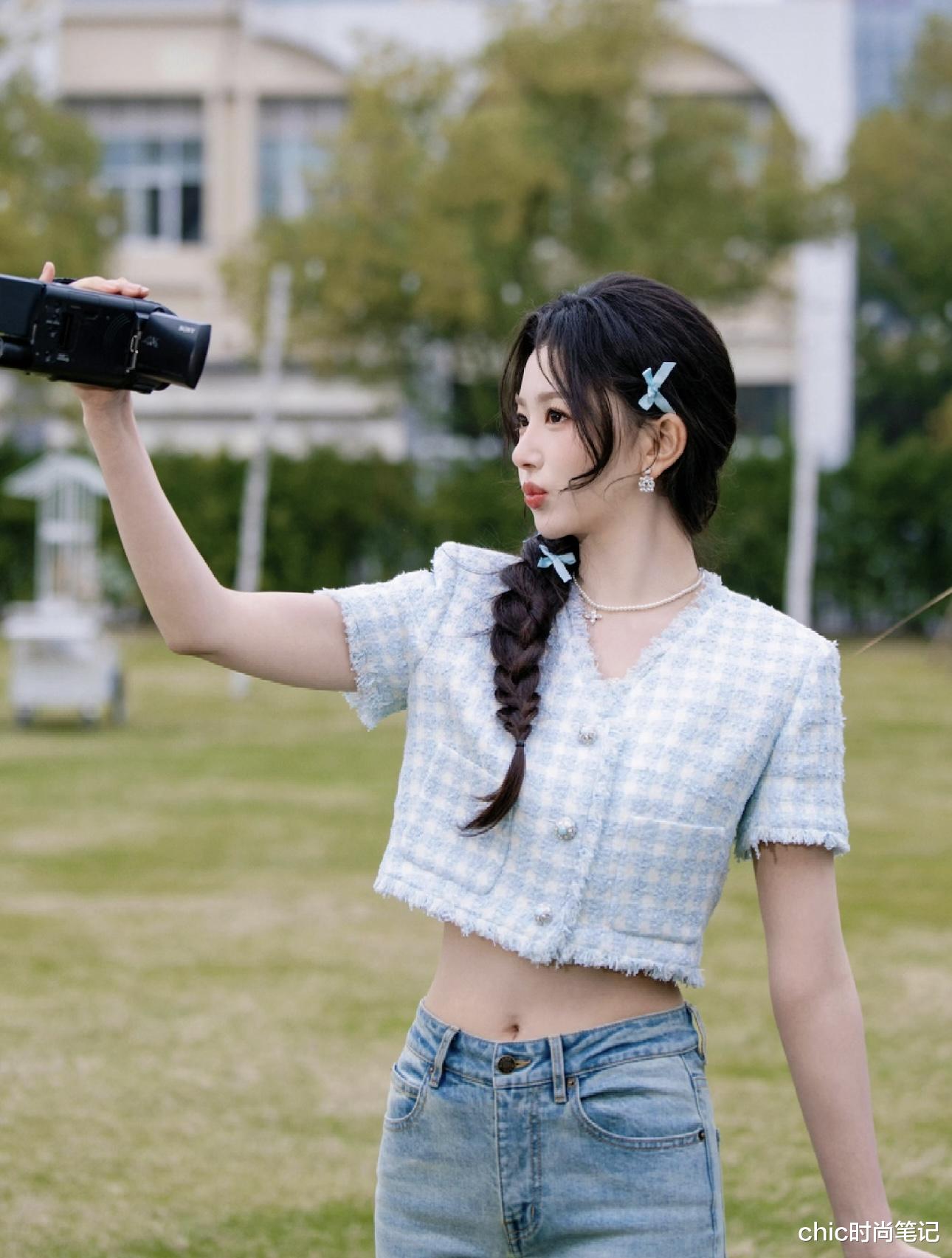 浅蓝色格子上衣是做了超短款的设计,有一种小香风的精致即视感,与发型上的蓝色蝴蝶结发卡相呼应。下身搭配浅色系低腰牛仔裤,有效露出小蛮腰,“心机”穿搭get!