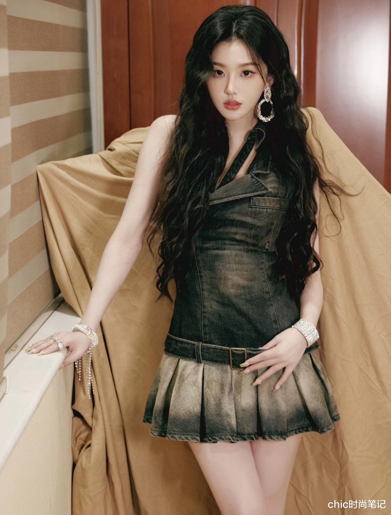 做旧款牛仔连衣裙充满了设计感,不规则领口与超短款的百褶裙摆自带爱豆风,露出的笔直双腿吸睛又动人,点缀上浮夸款耳环。