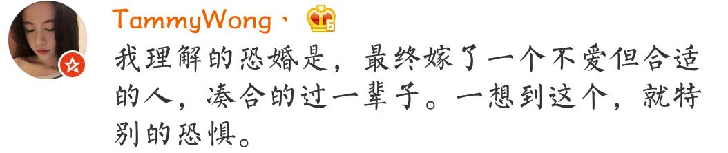 这种焦虑正在蔓延。某社交平台「恐婚」话题下有 128 万条讨论,高赞评论说:「不是不想结婚,是怕结婚后发现,原来爱情也会过期。」另一张在微博转发超 10 万次的截图里,用户 TammyWong 写道:「我理解的恐婚是,最终嫁了一个不爱但合适的人,凑合过一辈子。一想到这个,就特别恐惧。」