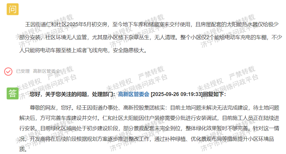 针对网友关注的问题,高新区管委会回复表示,经王因街道办事处、高新控股集团核实:目前土地问题未解决无法完成建设,待土地问题解决后,方可完善车库建设并交付。仁和社区太阳能因住户装修需要分批进行安装调试,目前施工人员正在陆续进行安装。目前绿化区域尚处于初步建设阶段,部分景观配套未完全到位,整体绿化效果暂时不够完善。针对这一情况,开发商将在后续阶段根据规划方案逐步推进整改工作,通过补种绿植、优化景观布局等措施提升小区环境品质。