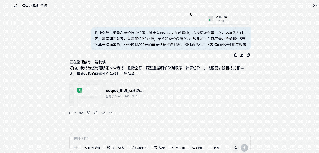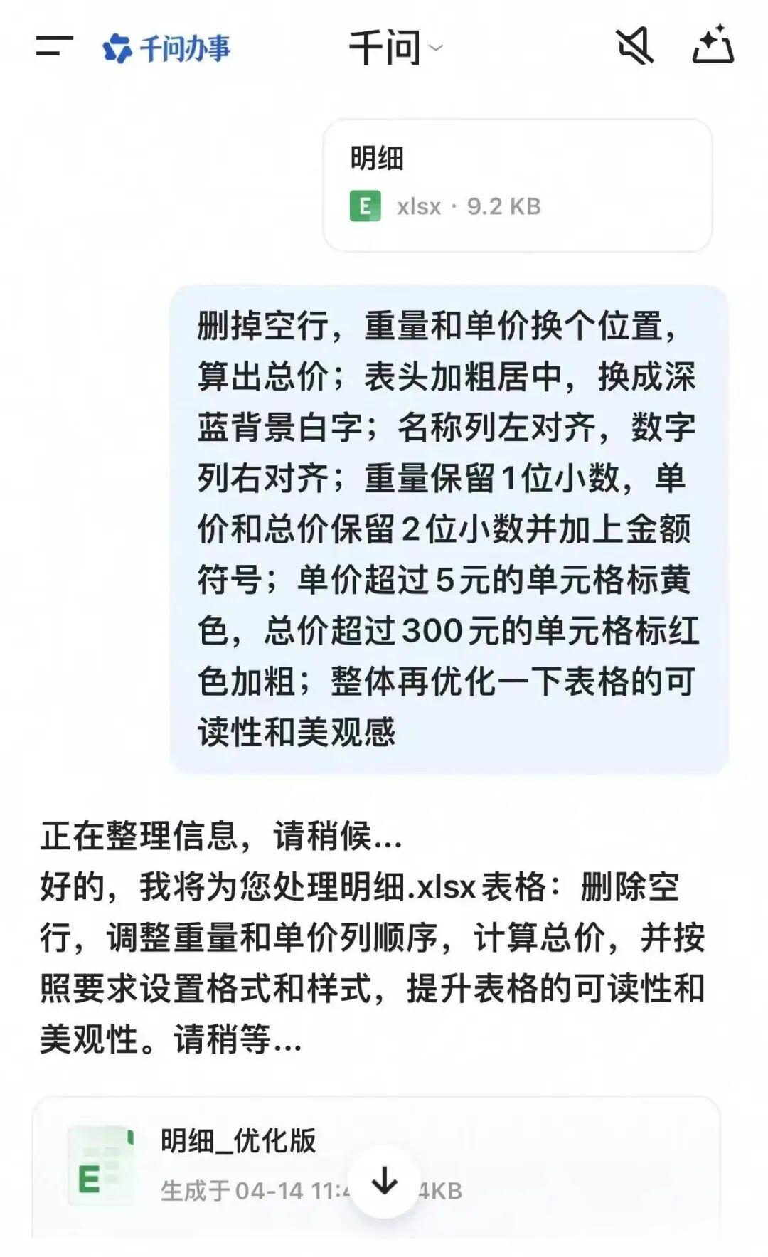 现在好了,你只需要把表格往千问里一甩,然后用大白话说出你的需求就完事儿。
