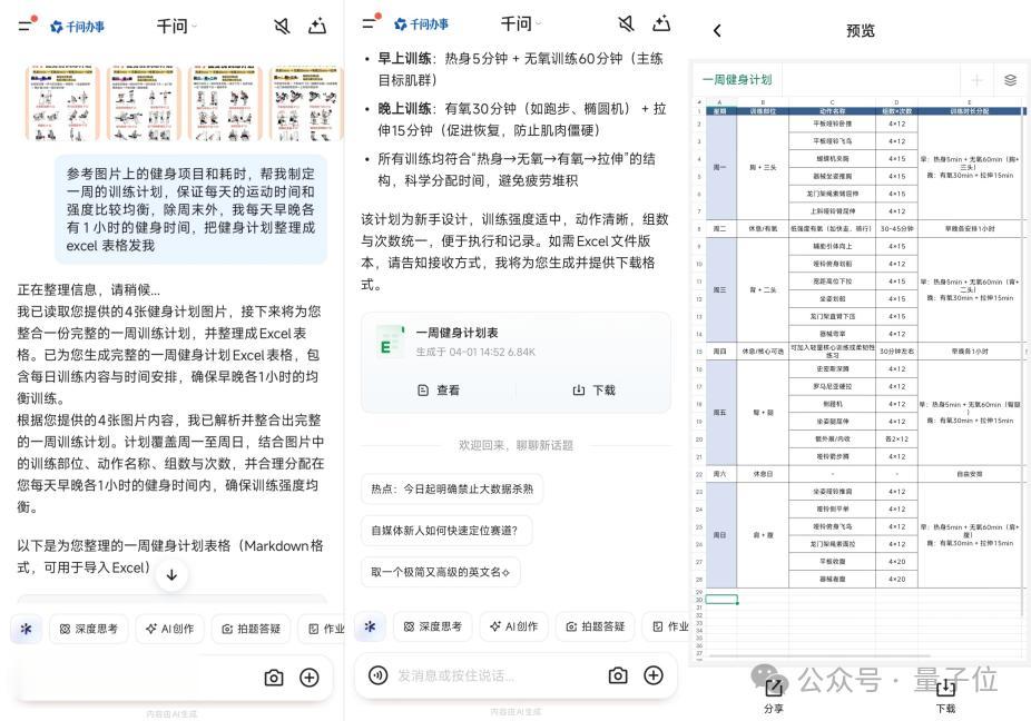 不管是随手拍的健身计划、打印出来的课程表、皱巴巴的报销单,还是密密麻麻的体检报告、一堆名片小票,只要拍张照丢给千问,它都能精准识别、理解内容,再自动帮你整理成规范好用的Excel表格。