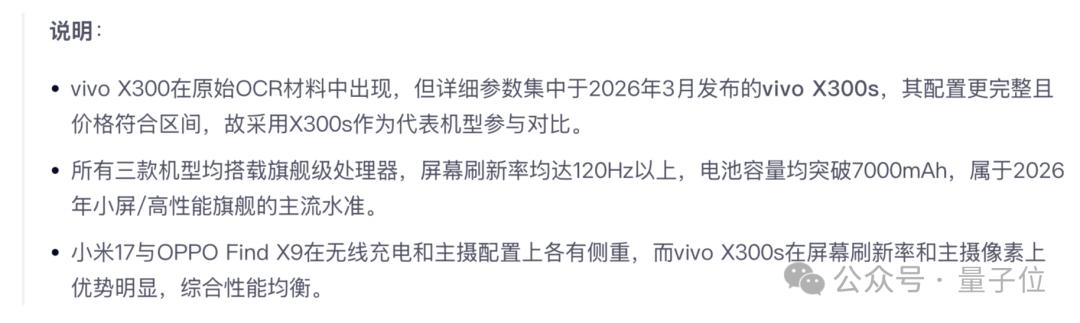 直接整出了vivo X300s、小米17和OPPO Find X9三款手机的对比,处理器、屏幕、电池、摄像头这些核心参数全都安排上了。
