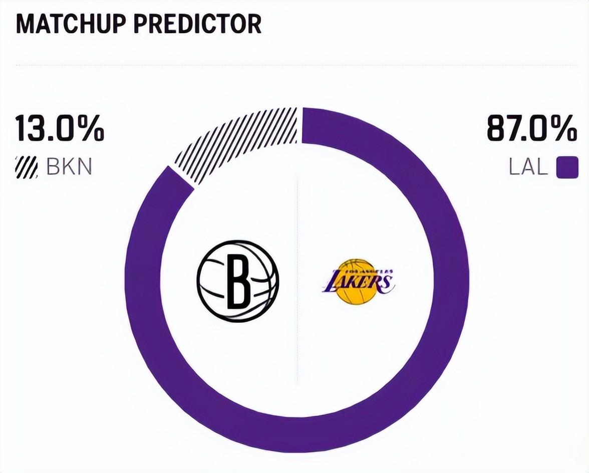 赛前,美媒ESPN对本场比赛进行了胜率预测,湖人队胜率高达87.0% ,篮网胜率则仅有13.0%,差距有点大 。