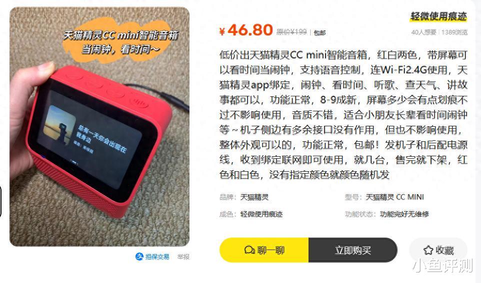 最近经常刷到,有人在出这个天猫精灵CC mini带屏幕的智能音箱。价格在50块左右,成色好点的要贵个20块,但想要捡漏的话,有一个老哥卖8-9层新的46块,还包邮!这价格,说它是电子玩具都感觉有点侮辱玩具了,这简直就是白送级别的边角料啊。