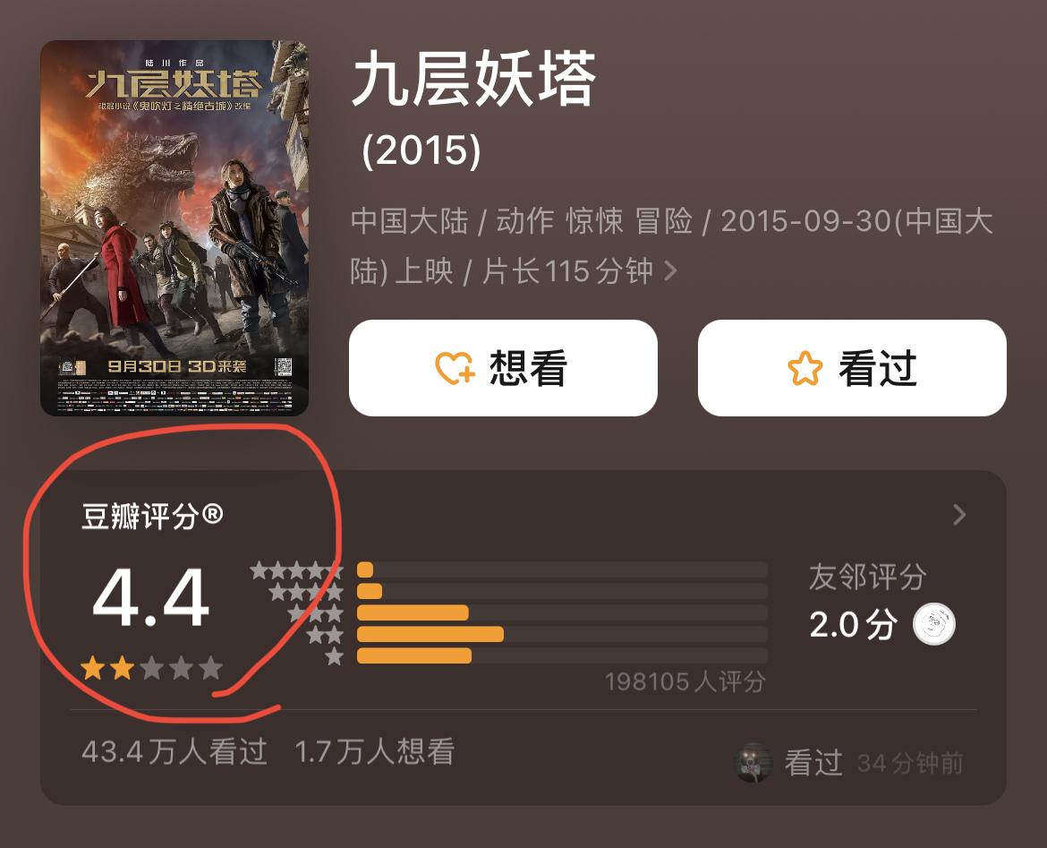 很多人看到《九层妖塔》是烂片,就以为《寻龙诀》也是烂片。但这么多年过去了,《寻龙诀》依然有7.4分。
