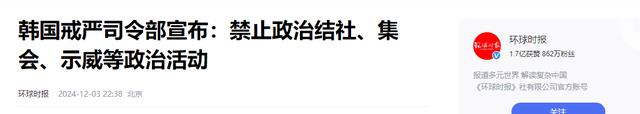 环球时报——韩国戒严司令部宣布:禁止政治结社、集会、示威等政治活动