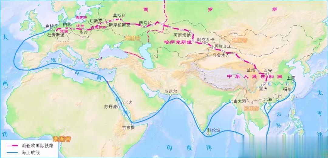 重庆、成都地僻西南。今渝新欧、蓉欧快铁,穿巴蜀,越秦陇,出西域,抵欧陆,旬月可至。重庆、成都商贾辐辏,货物堆积如山,如百川归海,蜀道有何难?