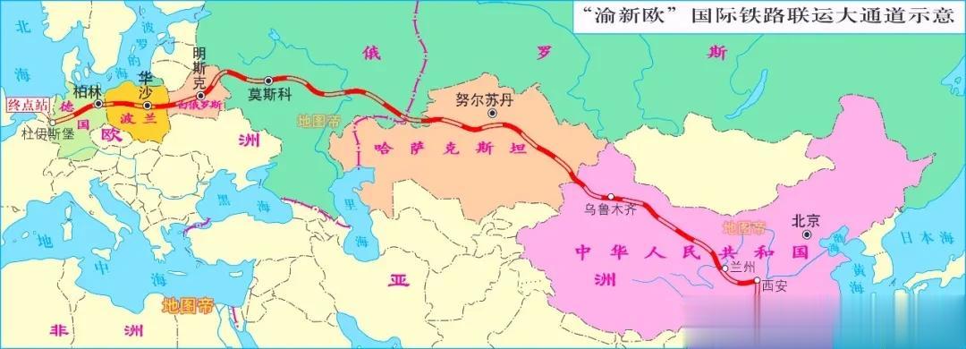 【4】始发陕西西安,经新疆阿拉山口,终点德国杜伊斯堡,全程9855.7千米,平均耗时13.7 天,上月发送21列。