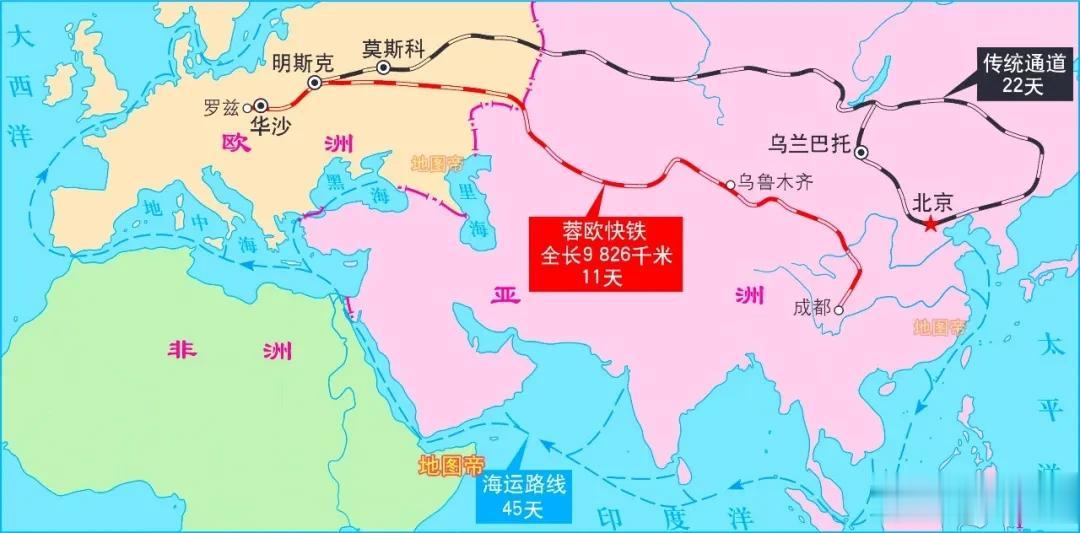【1】始发广东广州,经新疆霍尔果斯,终点波兰马拉舍维奇,全程11264.6千米,平均耗时15.6 天,上月发送9.9列。