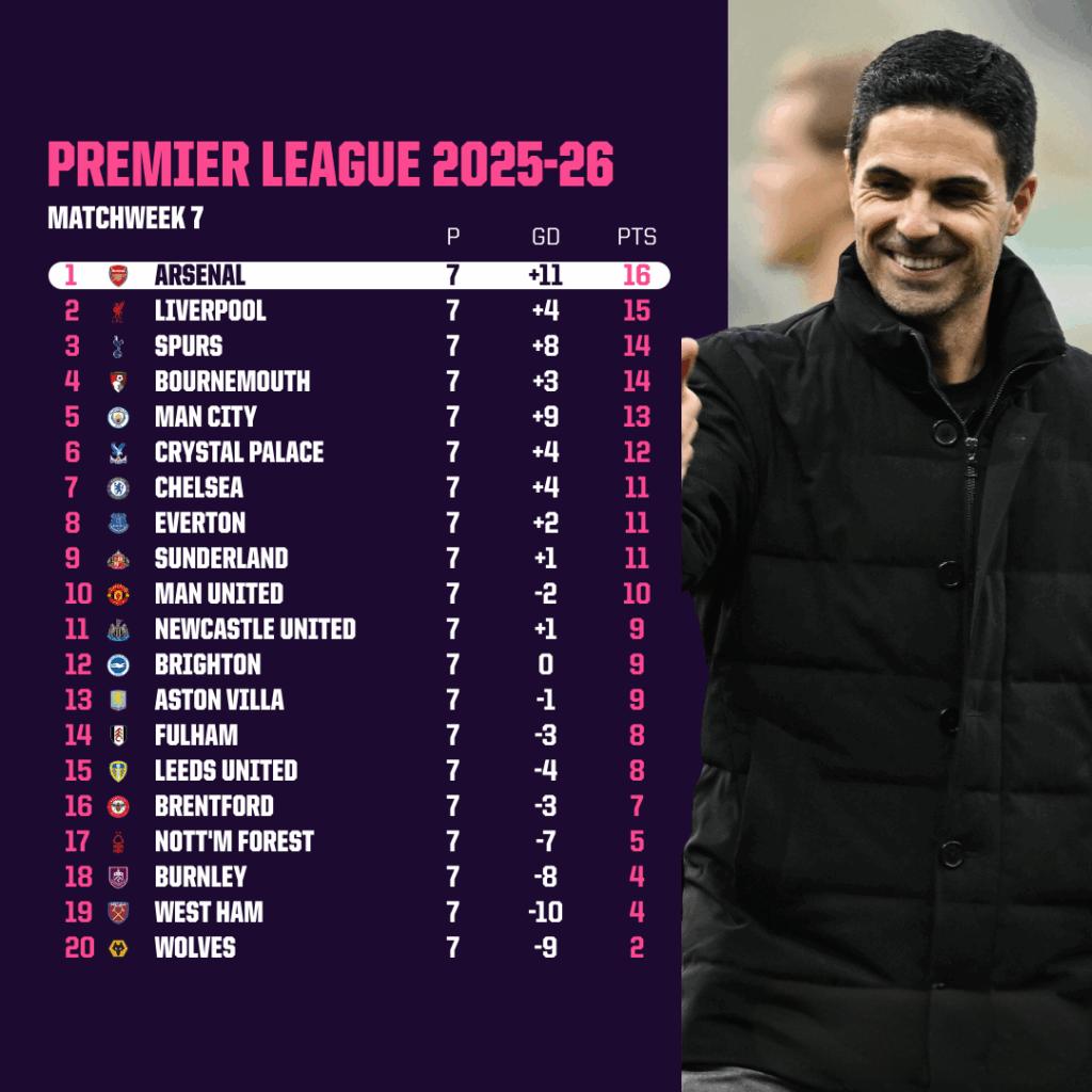 在还有93分可供争夺的情况下,1分的领先优势显然并非不可撼动。但在赛季的这个早期阶段,阿森纳看起来极其强大,而且明显没有弱点。他们现在的目标将是像去年的利物浦那样,在余下的赛季中守住榜首位置。