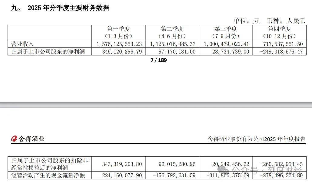 事实上,舍得酒业的业绩颓势贯穿了2025年全年,只有一季度维持住了基本盘,从二季度开始,营收就骤降至11.25亿元、净利润9717万元,三季度进一步滑落至10亿元、净利润仅2873万元,四季度营收7.18亿元,净利润则亏损2.49亿元,直接拖累了全年业绩表现。