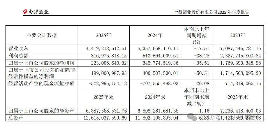 舍得酒业2025年年报显示,全年实现营业收入44.19亿元,较2024年的53.57亿元同比下滑17.51%;归属于上市公司股东的净利润2.23亿元,同比下降35.51%;扣除非经常性损益的净利润1.99亿元,同比大幅下滑50.31%,盈利规模已近乎腰斩。