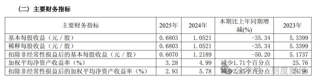 与此同时,反映赚钱能力的指标也在持续恶化。2025年,其加权平均净资产收益率仅3.28%,较上年减少1.71个百分点,而在两年前的2023年,这个数字还高达25.76%。