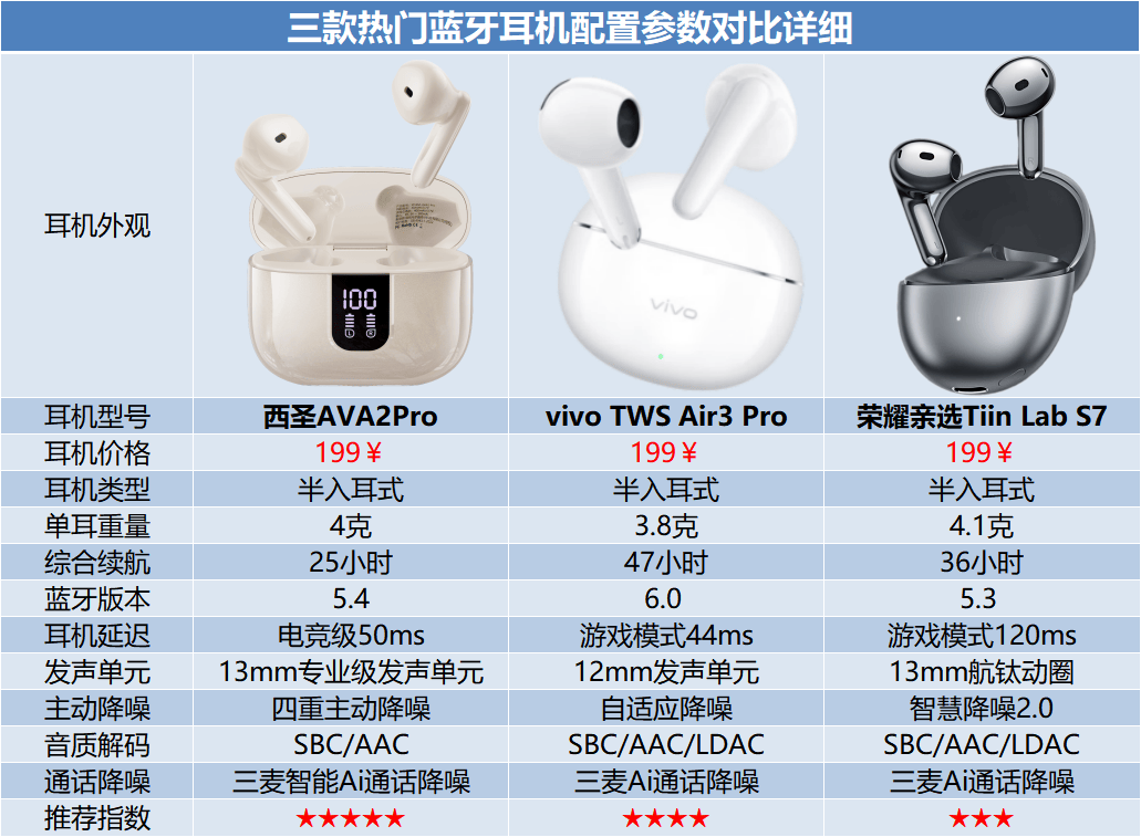 所以这次评测我选取了荣耀亲选TiinLab S7、vivo Air 3 Pro以及西圣AVA2 Pro三款热门机型,从佩戴舒适性、音质表现、蓝牙连接、延迟表现以及降噪能力等多维度进行深度对比,帮助你在预算和使用场景之间找到最合适的选择!