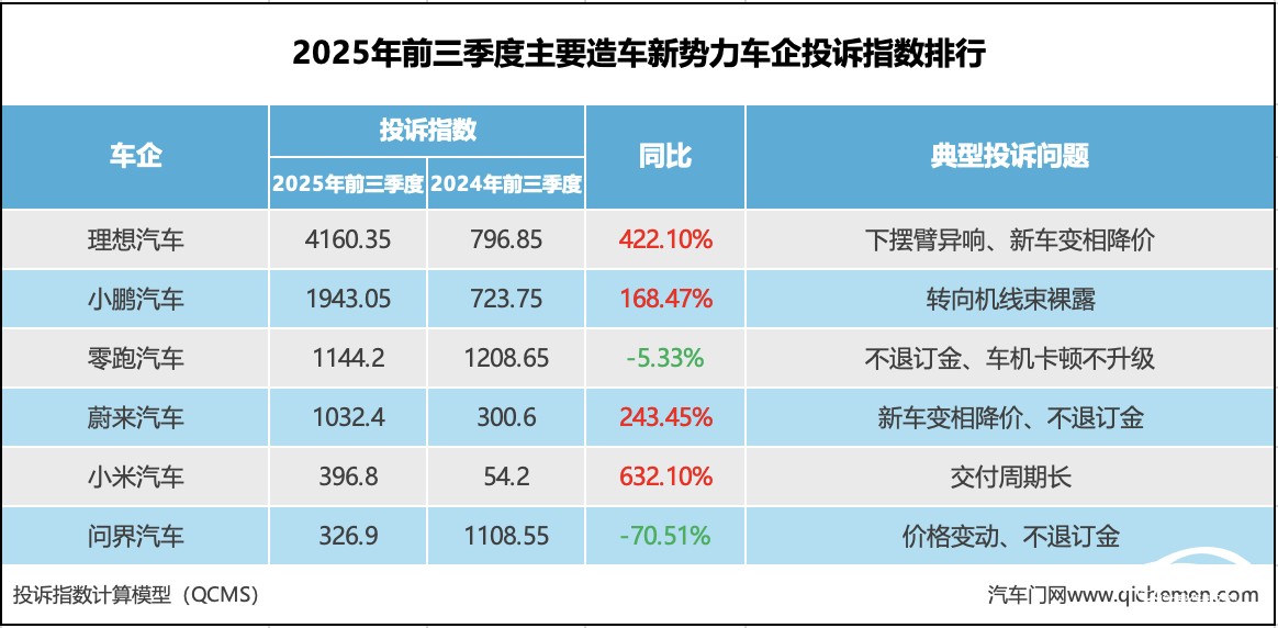 今年前三季度主要造车新势力的投诉指数正式出炉。