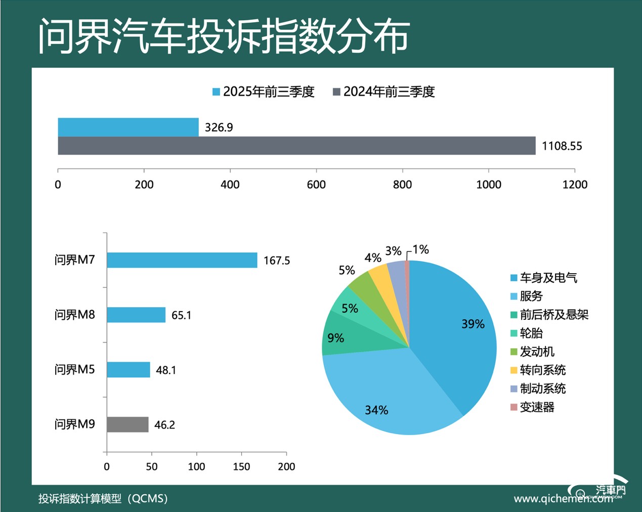 汽车质量投诉点评:问界汽车今年前9个月的投诉指数为326.9,与去年前三季度的投诉指数相比,同比下跌了70.51%,问界汽车收到投诉的主要原因是价格变动和不退订金。价格变动问题主要发生在2024款问界M7车型中。该问题收到集中投诉的时间段为今年的5月和6月。据悉,今年2月以来,问界汽车官方多次针对新款问界M7等车型推出最高52000元购车权益的优惠政策和升级激光雷达、底盘、音响等配置,此举引发不少问界M7老车主投诉。该车车主纷纷表示,希望厂家让其付费升级。此外问界汽车还因不退订金问题收到了投诉。