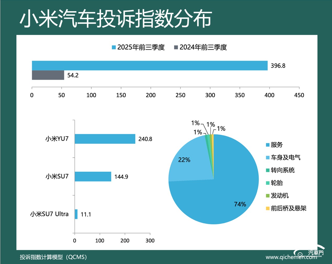 汽车质量投诉点评:今年前9个月小米汽车的投诉指数为396.8,同比激增632.1%,小米汽车收到集中投诉的主要原因是交付周期长。该投诉集中体现在小米YU7车型中。网络各平台关于小米汽车交付周期长的讨论屡见不鲜。不少小米YU7车主投诉称,小米汽车官方并未标明小米YU7提车周期,在订购该车锁单后交付时间长。还有该车车主反馈,下单时小米汽车官方系统存在BUG,发生自动锁单、锁单慢、信息异常等问题。很多车主纷纷投诉,要求小米汽车官网尽快处理问题,希望为其退订或尽快交车。