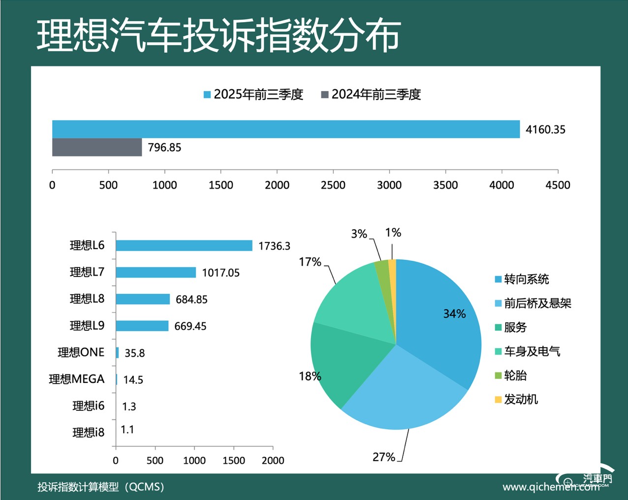 汽车质量投诉点评:2025年前三季度理想汽车的投诉指数上涨了四倍多,凭借4160.35的高投诉指数登上了投诉指数榜首。下摆臂异响和新车变相降价两大问题是理想汽车的典型问题。据悉各大网络平台关于理想汽车下摆臂异响的讨论屡见不鲜。针对该问题,今年8月理想汽车发布提供统一解决方案的官方公告。然而多名理想汽车车主仍然反馈称各地4S店的补偿标准不统一,存在“同故障不同补偿”的区别对待现象,并且售后客服响应效率低下。尽管理想汽车官方公告称在今年7月31日前将相关问题零件全部处理完毕,但针对该问题的投诉却仍旧不绝于缕。