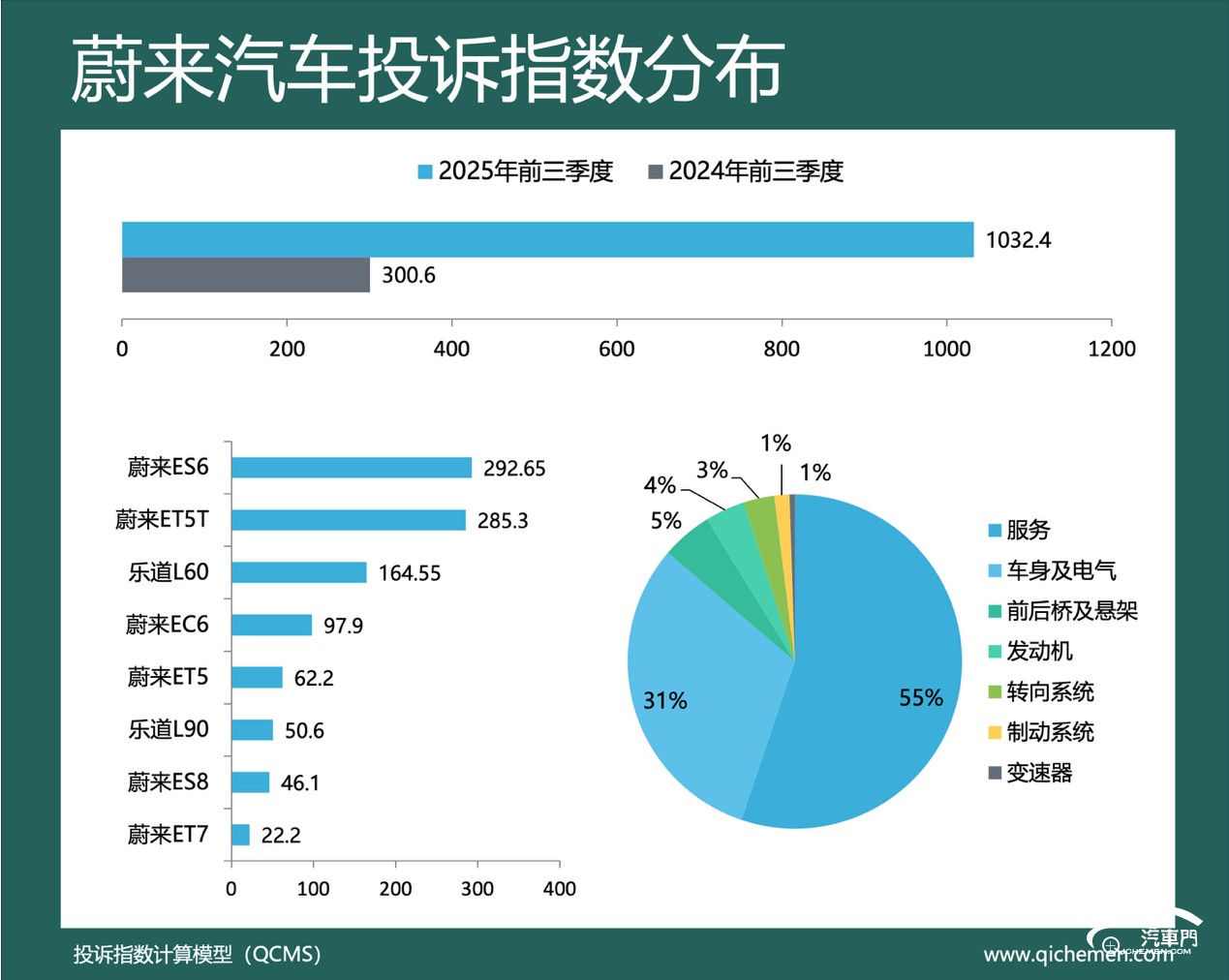 汽车质量投诉点评:蔚来汽车今年前三季度的投诉指数为1032.4,新车变相降价、不退订金成为蔚来汽车收到投诉的主要原因。今年蔚来汽车官方宣布,于今年8月19日起,蔚来汽车的蔚来100kWh长续航电池包价格从12.8万元下调至10.8万元,选择整车购买100kWh长续航电池包的全系新车价格也会同步调整。这代表用户不再需要额外花钱升级蔚来电池包,相当于变相降价3.8万元。蔚来汽车短时间内的降价增配遭到大量老款车车主的集体投诉。虽然蔚来汽车官方针对2025年1月1日至8月28日完成交付的蔚来ET5、蔚来ET5T、蔚来ES6、蔚来EC6、蔚来ET7、蔚来ES7、蔚来EC7和蔚来ES8老用户补偿发放价值6000元焕新礼金券,可用于增换购蔚来品牌全系新车时直接抵减车价。但不少蔚来汽车老车主并不满意蔚来汽车的补偿措施。