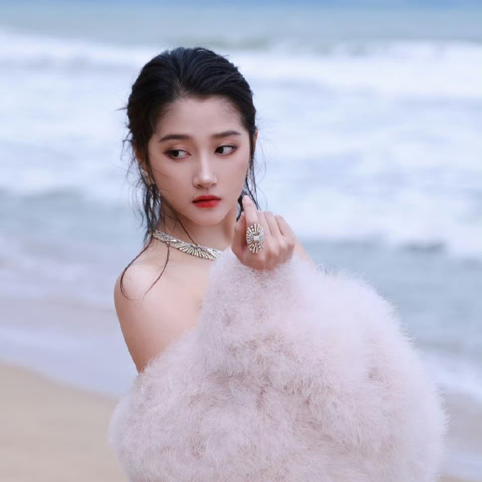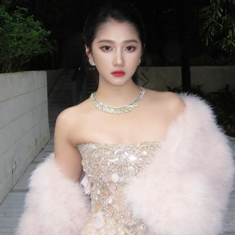 活动伊始,关晓彤以一袭Elie Saab 2025秋冬高定礼服亮相,瞬间锁定全场目光。香槟色薄纱上盛开着立体花朵刺绣,搭配FRED高级珠宝的璀璨流光,再披上一袭柔美的粉色皮草披肩,宛如从古典油画中走出的贵族少女。最令人称道的是礼服的斜肩设计——巧妙弱化了关晓彤曾被热议的肩宽问题,垂坠的线条更拉长了身形比例。当晚海边微风拂过,裙摆翩跹摇曳,她立于夜色中宛若“海神降临”,现场媒体连连按下快门,网友惊呼:“这次造型师必须加鸡腿!”