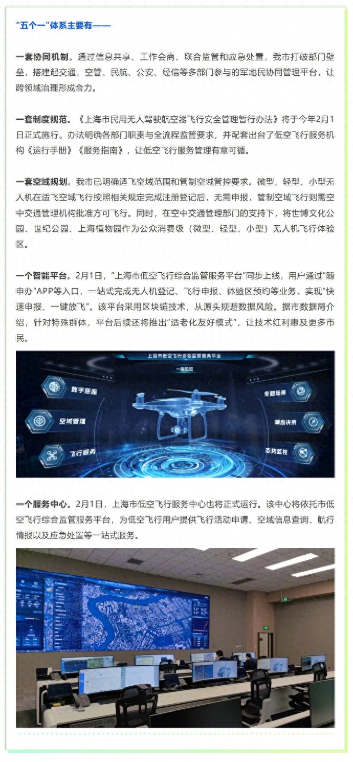 此外,自2月1日起,由市交通委、市公安局、市数据局、机场集团等多部门联合推出的本市加强低空飞行安全监管保障“五个一”体系及系列配套措施将正式落地运行。