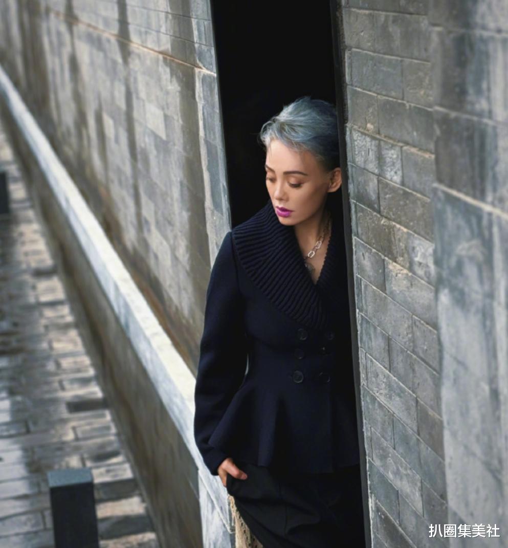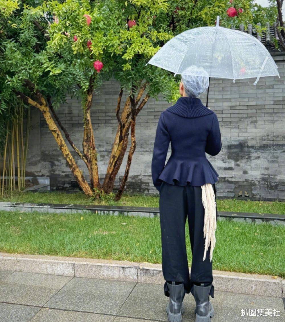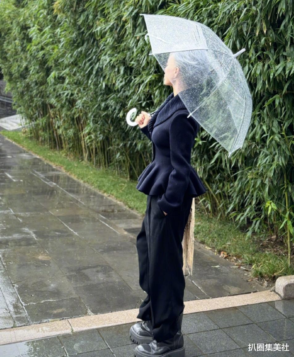 在精致的妆容下,虽是满头银丝,却不显半点苍老,再搭配上一袭黑色西装,另类的高级感便这样具象化了。