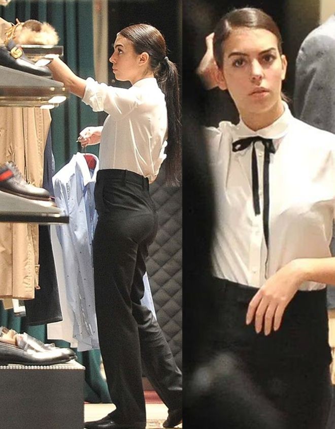 2016年,马德里的Gucci门店里,梳着马尾,穿着工作白衬衫,黑色工装裤的乔治娜认真工作,几乎没有妆容,大大的眼睛里全是迷茫。