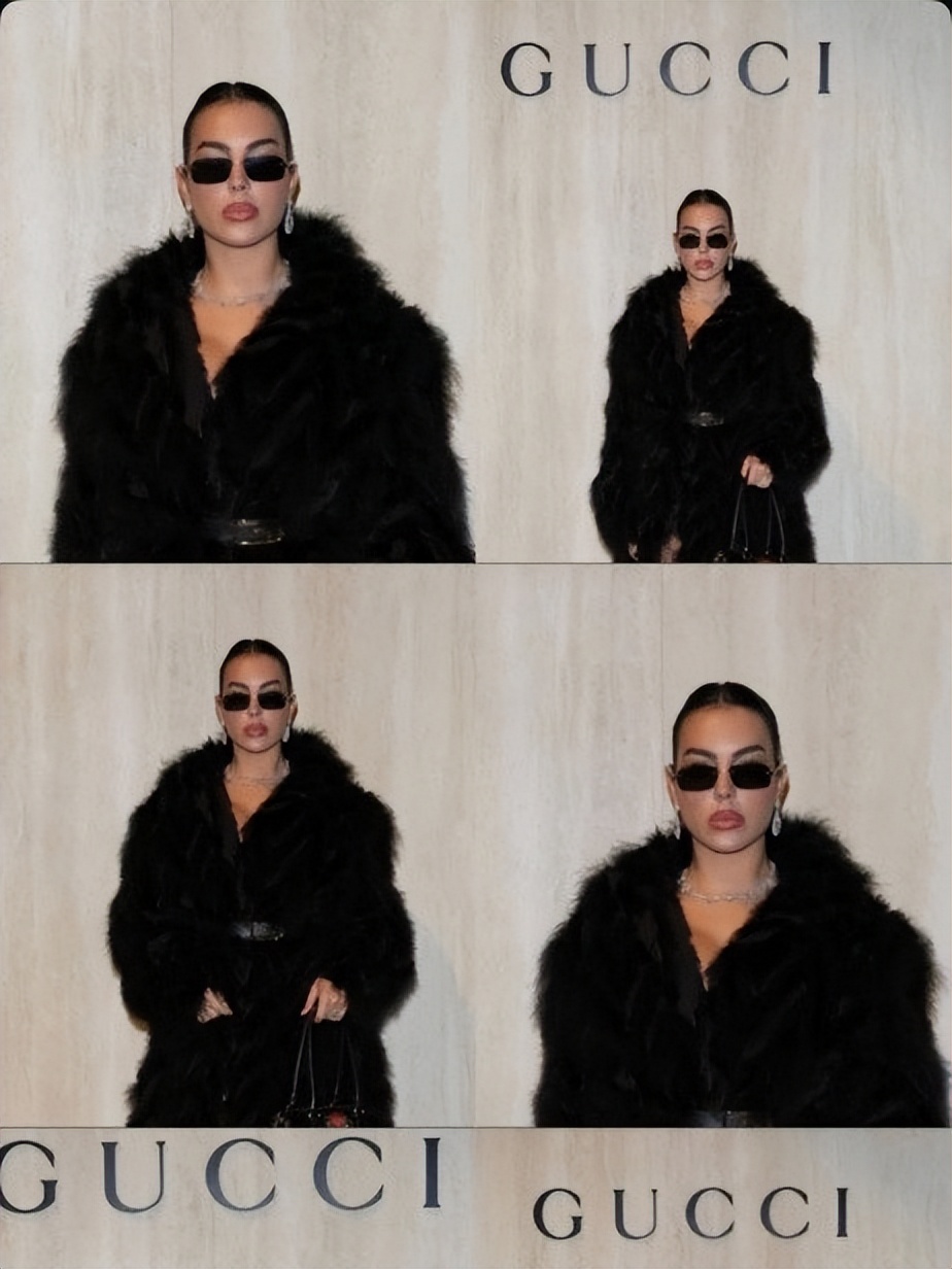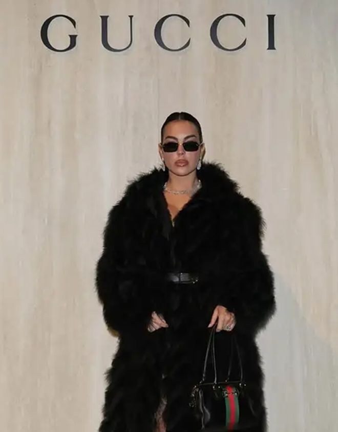 黑色墨镜,黑色Gucci当年最新款皮草大衣,同品牌包包,将品牌捧到了最高处,只是人们关注的还是乔治娜那张冷而酷的脸。